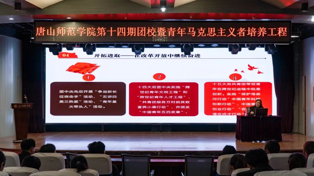 为深入学习宣传贯彻习近平新时代中国特色社会主义思想,培养新时代青年政治骨干、为党和国家事业注入青春力量,全面落实《关于深入实施青年马克思主义者培养工程的意见》和《中长期青年发展规划》要求,10月21日下午,唐山师范学院第十四期团校暨青年马克思主义者培养工程秋季团干培训班第一讲在十阶梯会议室隆重举行,团委书记隋雪莲、马克思主义学院教师杜小洁出席了本次活动。