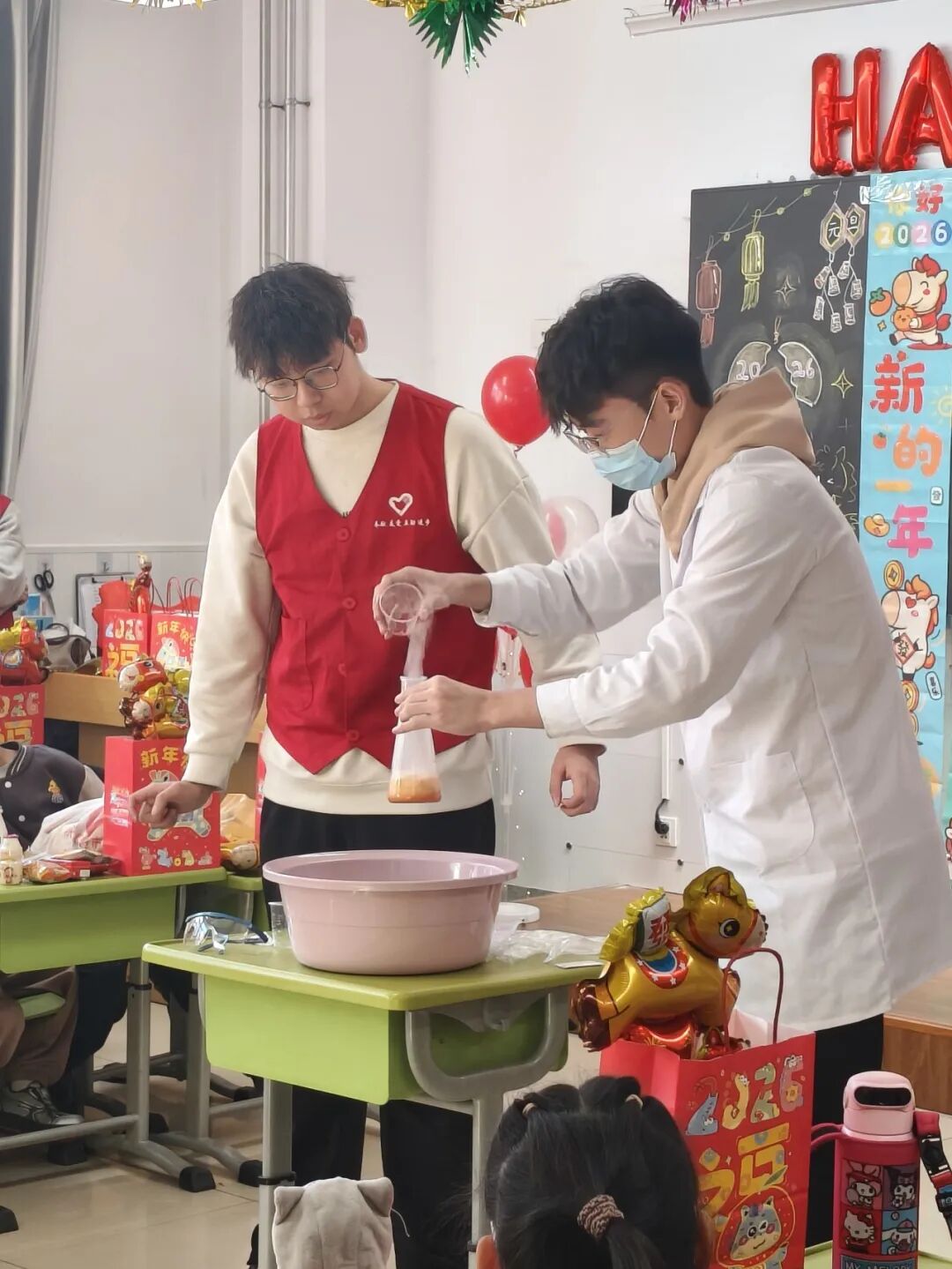 传科普送温暖,启智慧迎新年。从科普实验道具的摆放到互动区域的规划,数学与计算科学学院志愿者在每一个细节上都力求细致周全;聚焦科学启蒙,将趣味实验作为核心载体,为孩子们带来了经典的“大象牙膏”科学魔法实验。实验过程中,志愿者们一边规范操作演示,一边用通俗易懂的语言拆解化学反应原理,神奇的实验现象引得孩子们连连惊叹,现场互动热情高涨,欢笑声此起彼伏。
