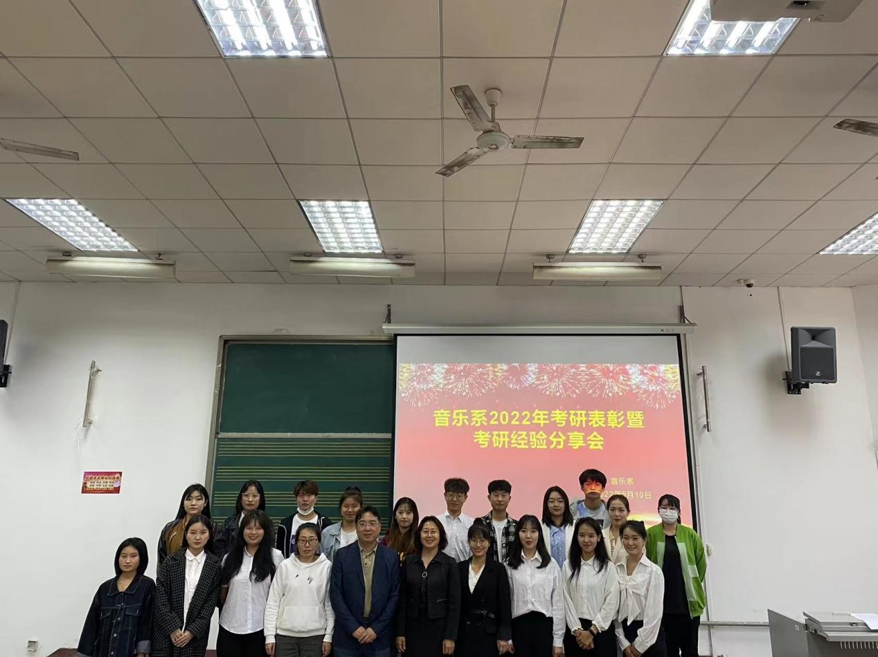 今年音乐系研究生升学考试共有16名学生考取了首都师范大学、天津理工大学、河北大学、海南大学、河南大学、苏格兰皇家音乐学院等国内外名校硕士研究生。会上,党总支副书记董怀晶宣读了考研表彰名单,与会领导为考研学生颁发了荣誉证书和奖品并合影留念。考研学生代表18级刘乐然、崔宇彤、麻文杰、冯豆依次从不同专业、不同角度分享了自己在考研过程中各个学科学习的经验和心得体会。随后大家一起观看了考研学生们精心录制的视频,表达对母校、对老师们的感激之情,对学弟学妹的嘱托——星光不负赶路人,时光不负有心人,我们终将上岸,阳光万里。