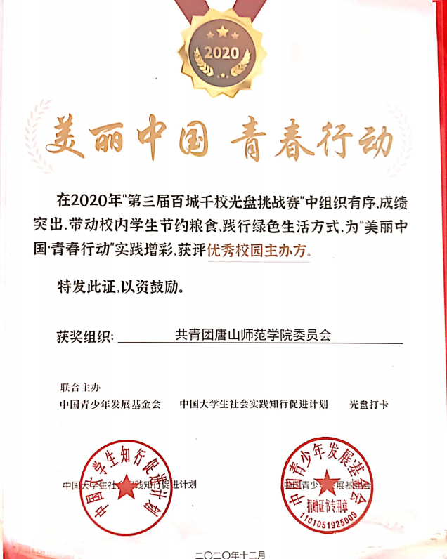 唐山师范学院共青团委员会在第三届光盘挑战大赛中荣获优秀校园主办方称号